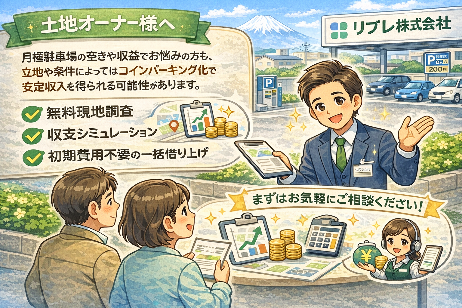 リブレ株式会社では、無料現地調査、収支シミュレーション初期費用不要の一括借り上げ